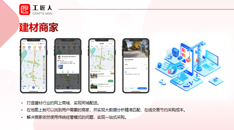 建材采购是工程建设中的重要环节。工匠人APP的“找建材”功能将附近海量的苗木类、石材类、钢材类等建材商家与采购方进行有效撮合。