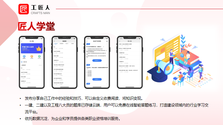 匠人学堂共建工程类专业在线学习、实战视频分享、教授答疑平台,帮助工匠人不断提升职业技能和素养。