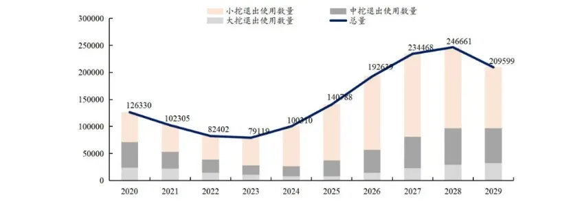 根据周期更新替换理论,本轮周期将于2028年到达周期高点,挖机销量将达到25万台。考虑到不同规格挖机在获得成本及使用寿命上有所不同,按照小/中/大挖平均寿命分別为6-8年、7-9年、8-10年来进行测算,并假设退出比例为30%、30%、40%。例如小挖在使用6年后退出30%,使用7年后退出30%,使用8年后退出40%。挖机退出使用数量就约等于新增需求,按照以上测算,可以认为本轮周期将于2028年达到周期高点,高点的挖机销量约25万台,与2024年内销10万台相比还有150%上行空间。