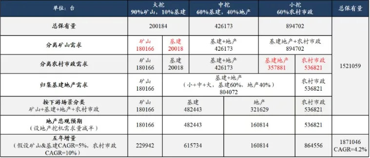按照大挖90%矿山占比,小挖60%农村市政占比,基建地产需求基建60%、地产40%的结构拆分。2024年的152万挖掘机保有量中,纯地产需求保有量约32万台。