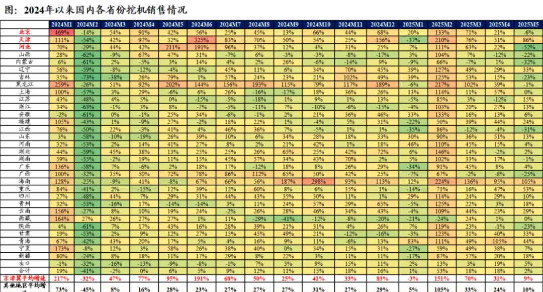 国内市场由资金主导,2024年以来京津冀地区平均增速远高于其他地区,主要系2023年底增发的万亿国债发挥作用。根据国务院新闻办的发言,23年底增发的万亿国债专门支持以京津冀为重点的华北地区等灾后恢复重建。具体领城来看,超过一半用于防洪排涝等相关水利设施建设,20%用于京津冀灾后重建,与小挖需求高相对应。