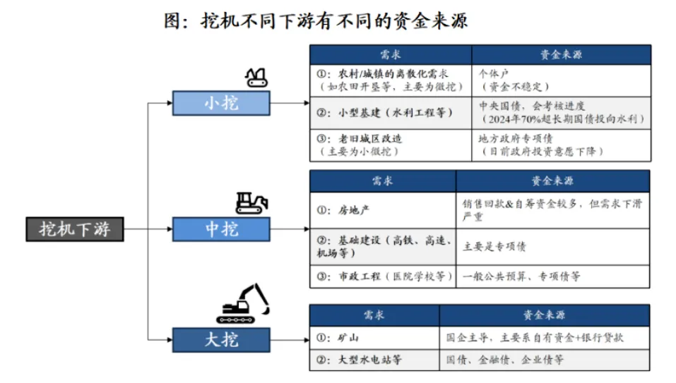 2024年以来小挖的表现远好于中大挖,核心原因在于小挖的下游水利工程的资金方为中央下发的特别国债,下发后对资金投向,开工时间、资金使用进度等有较高要求。但中大挖表现较差主要为地方债从2023年开始加码用于偿还拖欠企业账款、PPP欠款、土地储备。所以2025年看似是4.4万亿元的新增地方债,实际上能够形成实物工作量的部分只有2.3万亿元,截止到Q3使用了不到2万亿元。