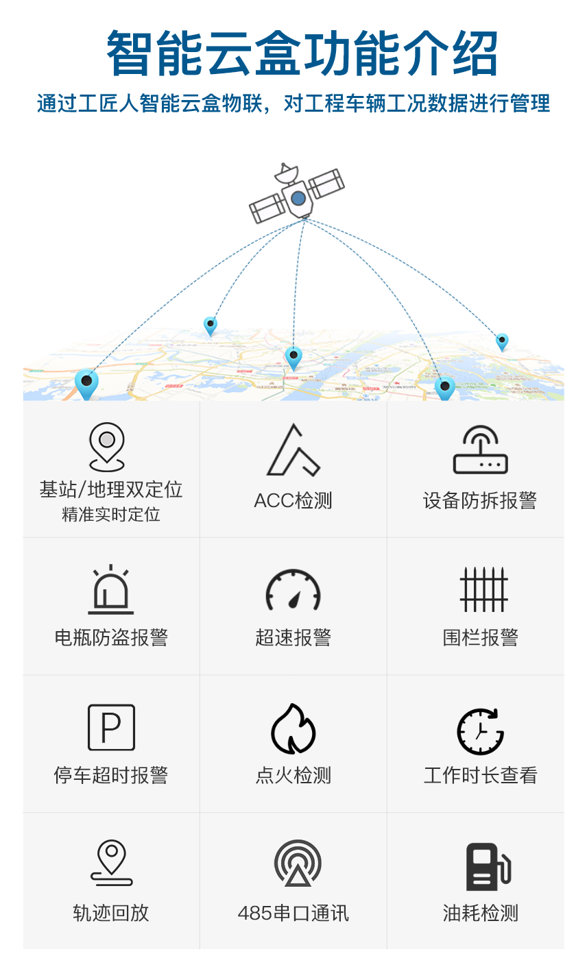 工匠人智能云盒是一套集软硬件一体化的机械智能管理系统,通过为机械安装智能云盒,结合PC端管理系统和移动端APP应用,远程监控机械,为工程机械行业提供全面的物联网解决方案。